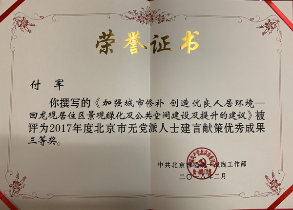 为鼓励和表彰先进,展示首都无党派人士在服务首都发展中的突出贡献,2018年2月,北京市委统战部开展无党派人士优秀建言献策成果评选表彰工作。经过遴选评比,昌平区政协委员、金沙集团1862cc成色副院长付军教授的“加强城市修补创造优良人居环境——回龙观居住区景观绿化及公共空间建设及提升的建议”,被评为2017年度北京市无党派人士建言献策优秀成果三等奖。据悉,在此次评选中,全市共有33篇优秀成果获得嘉奖,其中特等奖3篇,一等奖5篇,二等奖10篇,三等奖15篇。