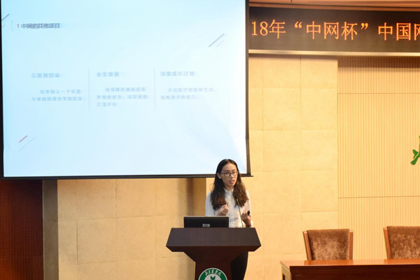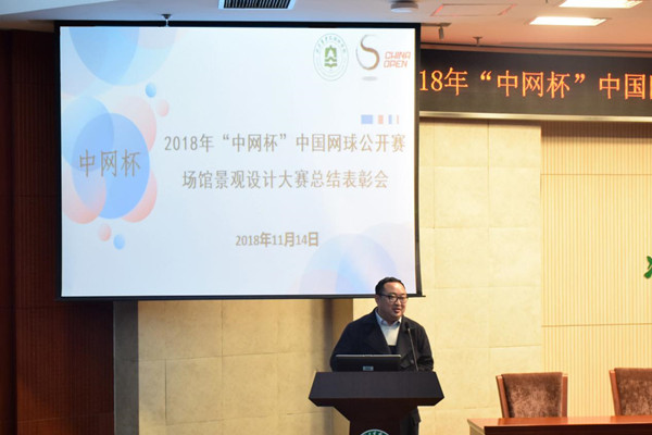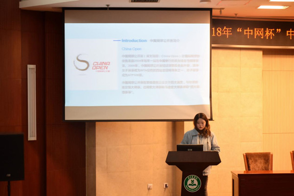 2018年“中网杯”中国网球公开赛场馆景观设计大赛一等奖代表王萌进行获奖作品展示,中国网球公开赛志愿者代表学院2015级旅游管理专业王尧鑫同学进行分享发言。