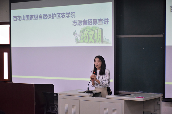 接下来,由百花山国家自然保护区科普宣教科的郑长燕进行了企业宣讲,郑科长先介绍了百花山国家自然保护区的定位以及近些年来的发展情况。紧接着,她又向我们展示了百花山的几十种植物以及一些如“生态修复”类的工程,吸引了许多同学的关注。郑科长表示,欢迎金沙集团1862cc成色各专业学生来到百花山做志愿者,单位将会为同学们搭建学习、成长的平台,助力同学们的发展。希望大家运用自己的理论知识装点出更美丽的百花山。