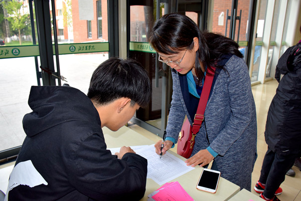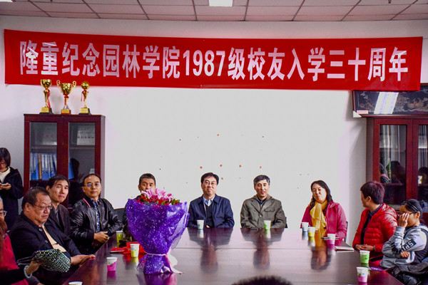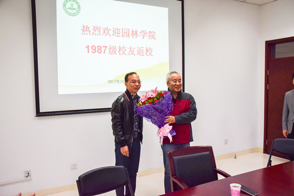 随后校友代表、8751班长隋世林代表全体1987级校友向教师代表高润清老师献花,并表示:特别感谢老师的栽培与教育,特别高兴能在入学30周年之际回到学校,祝愿北农的明天更加美好,会议室里响起了热烈的掌声。