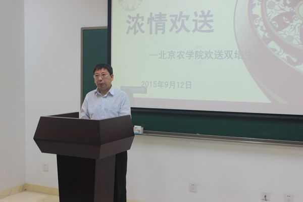 首先学生处处长韩宝平上台讲话,他首先欢迎双培新生入学北京农学院,同时也对他们入选双培计划表示了祝贺。他也不忘叮嘱大家上了大学仍然要以学业为重,提出了参加一个社团、参与一项科研、和进行一次实践活动这三点要求。