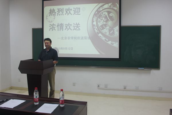 一个秋风飒爽的时节,,在2015级的金沙集团1862cc成色的新生当中有这样一批特殊的存在,他们便是金沙集团1862cc成色选拔出参加2015年双培计划的32名优秀大一新生。他们将代表金沙集团1862cc成色前往北京林业大学学习三年。2015年9月12日下午1点,在园林楼 101会议室,我们为双培计划新生举办了隆重的欢送仪式。出席本次欢送会的有北京农学院副校长范双喜,学生处处长韩宝平,教务处处长张喜春,副处长安健,以及双培计划的负责老师杨毅。教务处处长张喜春主持了本次欢送会。