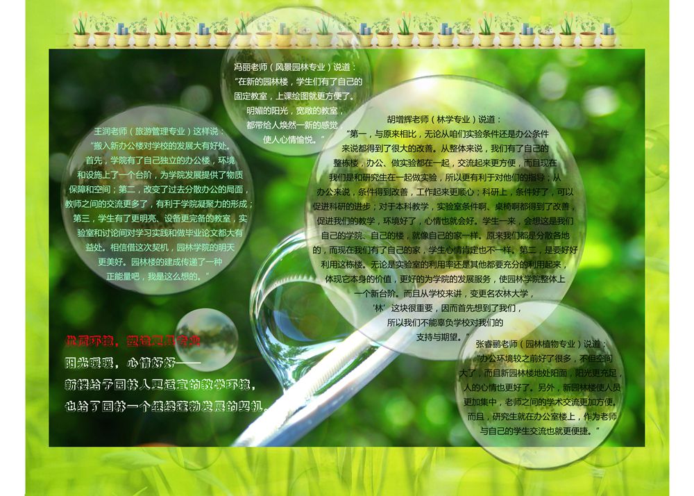 ① 冯丽老师(风景园林专业)说道:“在新的园林楼,学生们有了自己的固定教室,上课绘图就更方便了。明媚的阳光,宽敞的教室,都带给人焕然一新的感觉,使人心情愉悦。”