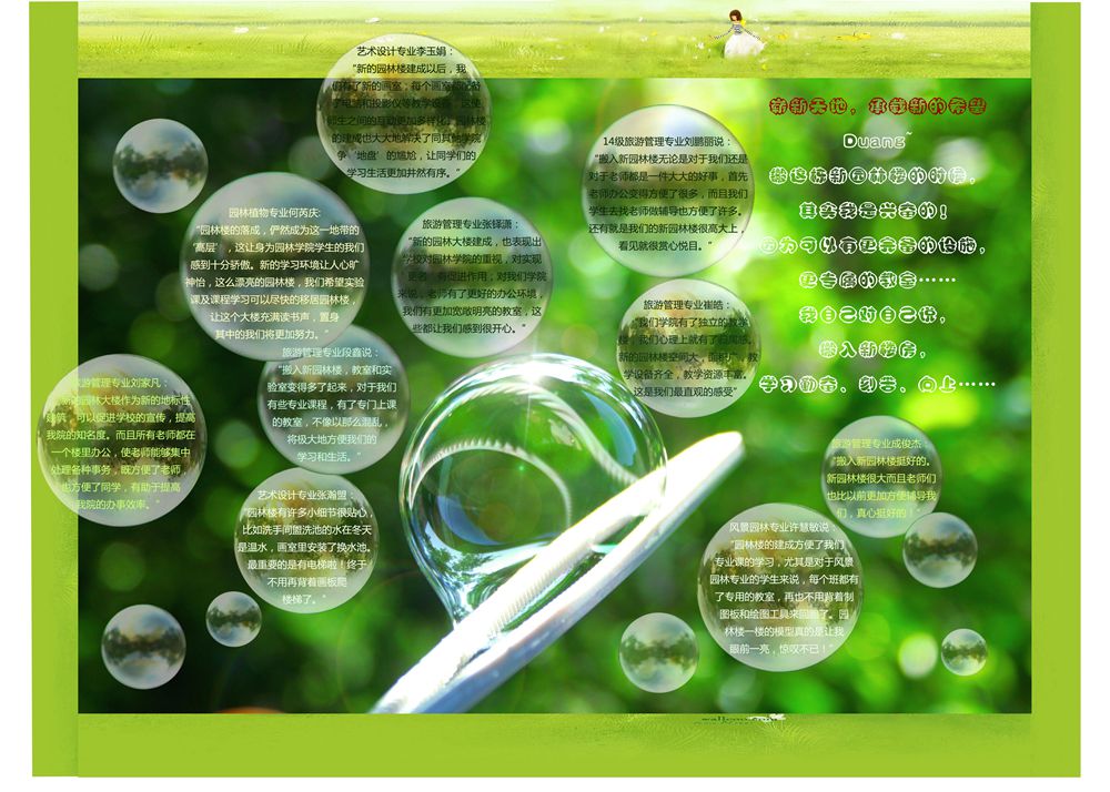 ⑩ 园林植物专业何芮庆:“园林楼的落成,俨然成为这一地带的‘高层’,这让身为学院学生的我们感到十分骄傲。新的学习环境让人心旷神怡,这么漂亮的园林楼,我们希望实验课及课程学习可以尽快的移居园林楼,让这个大楼充满读书声,置身其中的我们将更加努力。”