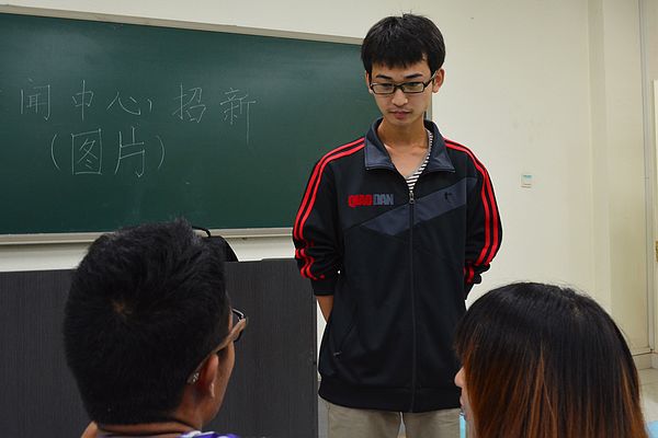 为吸纳新一届新闻中心成员,让饱含着激情与热血的新生力量尽早加入到这个优秀的集体,共同壮大我院发展新闻媒体事业的力量,2014年9月2日晚八点半在教B305和304教室,我院新闻中心文字组及图片组召开了每年一度的面试招新大会。12级、13级新闻中心文字组、图片组的相关负责人参加了本次面试,来自14级金沙集团1862cc成色各专业共计26名同学报名参加了此次招新。大会分面试自我介绍和笔试现场写稿两个环节。